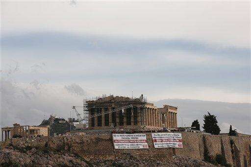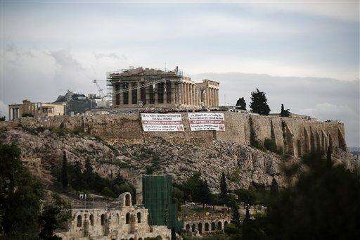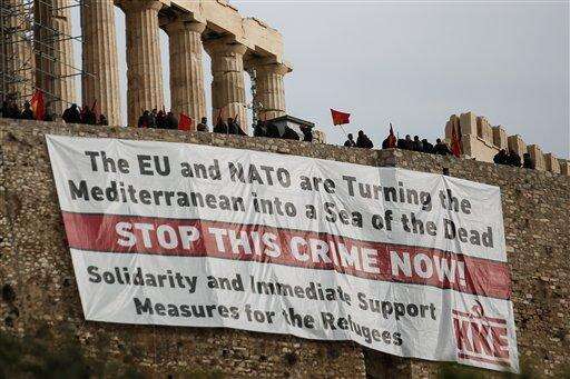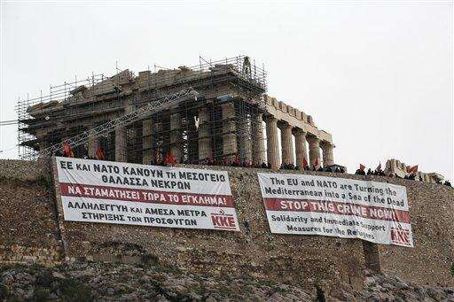 Supporters of the communist-affiliated union PAME stand atop the Acropolis hill after hanging banners in front of the temple of the Parthenon,in English and Greek, demanding help for refugees, in Athens, Saturday, Oct. 31, 2015. At least 27 people, more than half of them children, died in waters off Greece Friday trying to fulfill their dream of a better life in Europe. The tragedy came two days after a boat crammed with 300 people sank off Lesbos in one of the worst accidents of its kind, leaving 29 dead. (AP Photo/Yorgos Karahalis) The Associated Press