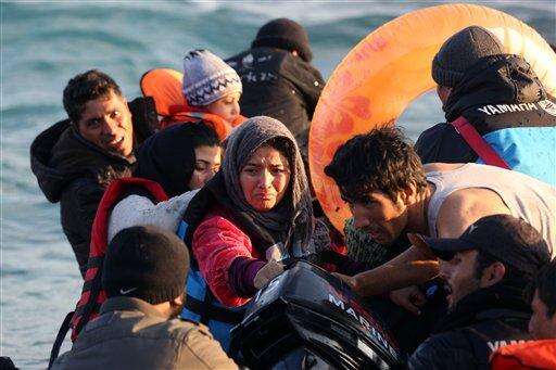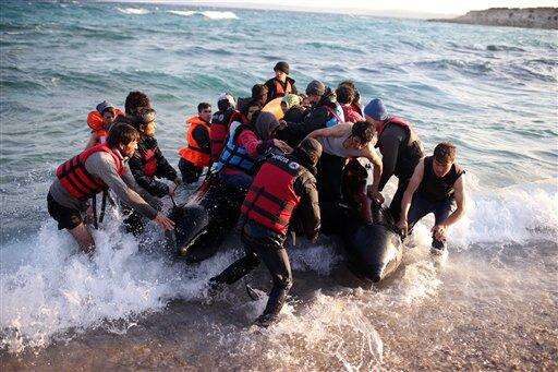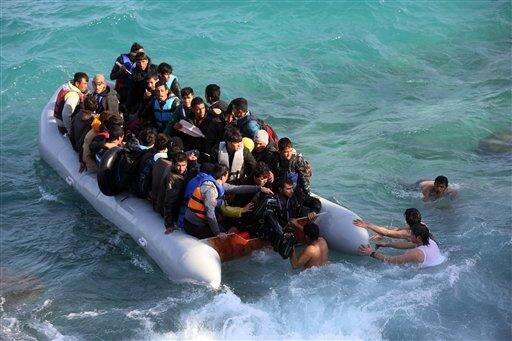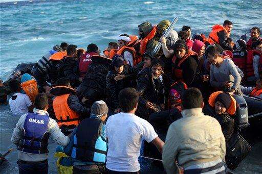 Refugees and migrants try to board a dingy as they set out, trying to travel from the Turkish coast to the Greek island of Chios, near Cesme, Turkey, Saturday, Oct. 31, 2015. Authorities in Greece say 21 people have died in other islands after two boats carrying migrants and refugees from Turkey to Greece sank overnight, in the latest deadly incidents in the eastern Aegean Sea. (AP Photo/Emre Tazegul) The Associated Press