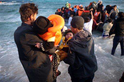 Men hold babies as refugees and migrants board a dingy as they set out, trying to travel from the Turkish coast to the Greek island of Chios, near Cesme, Turkey, Saturday, Oct. 31, 2015. Authorities in Greece say 21 people have died in other islands after two boats carrying migrants and refugees from Turkey to Greece sank overnight, in the latest deadly incidents in the eastern Aegean Sea. (AP Photo/Emre Tazegul) The Associated Press