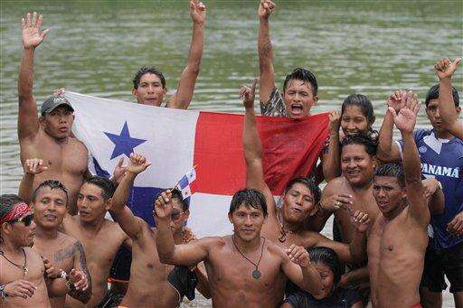 Indigenous men from Panama hold a Panamanian flag as they celebrate winning the canoeing event at the World Indigenous Games in Palmas, Brazil, Saturday, Oct. 31, 2015. The first edition of the World Indigenous Games, which brought delegates representing first nations from across the globe to a remote outpost in the heart of Brazil, was wrapping up on Saturday after nine days of traditional sports, dancing, trading and inter-cultural exchange. (AP Photo/Eraldo Peres)