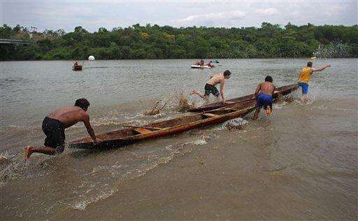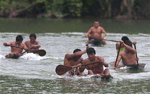 Climaco, front, and teammate Atilinio, Embara indigenous men from Panama, paddle to win the canoeing event at the World Indigenous Games in Palmas, Brazil, Saturday, Oct. 31, 2015. The first edition of the World Indigenous Games, which brought delegates representing first nations from across the globe to a remote outpost in the heart of Brazil, was wrapping up on Saturday after nine days of traditional sports, dancing, trading and inter-cultural exchange. (AP Photo/Eraldo Peres)