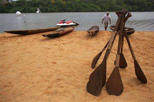 Boating equipment stands on the banks of the Taquarussu River before the start of the canoe event at the World Indigenous Games in Palmas, Brazil, Saturday, Oct. 31, 2015. The first edition of the World Indigenous Games, which brought delegates representing first nations from across the globe to a remote outpost in the heart of Brazil, was wrapping up on Saturday after nine days of traditional sports, dancing, trading and inter-cultural exchange. (AP Photo/Eraldo Peres)