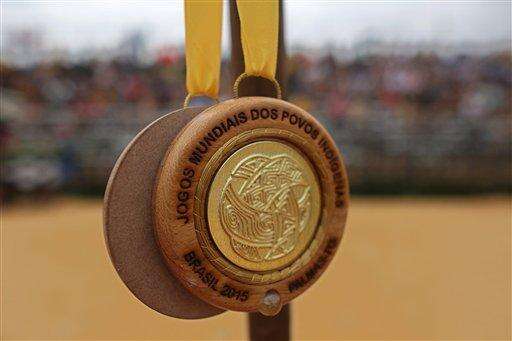The award medal for the canoe event hangs at the World Indigenous Games in Palmas, Brazil, Saturday, Oct. 31, 2015. The first edition of the World Indigenous Games, which brought delegates representing first nations from across the globe to a remote outpost in the heart of Brazil, was wrapping up on Saturday after nine days of traditional sports, dancing, trading and inter-cultural exchange. (AP Photo/Eraldo Peres)
