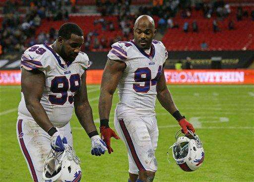 Buffalo Bills defensive tackle Marcell Dareus (99) and defensive end Mario Williams (94) leave the field after the NFL game between Buffalo Bills and Jacksonville Jaguars at Wembley Stadium in London, Sunday, Oct. 25, 2015. The Jaguars won 34-31. (AP Photo/Matt Dunham) The Associated Press