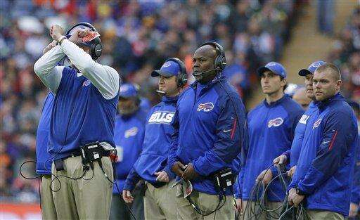 Buffalo Bills head coach Rex Ryan, left, gestures as he stands on the touchline during the NFL game between Buffalo Bills and Jacksonville Jaguars at Wembley Stadium, London, Sunday, Oct. 25, 2015. (AP Photo/Matt Dunham) The Associated Press