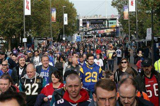 Spectators fill Wembley Way as they arrive for the NFL game between Buffalo Bills and Jacksonville Jaguars at Wembley Stadium in London, Sunday, Oct. 25, 2015. (AP Photo/Tim Ireland) The Associated Press