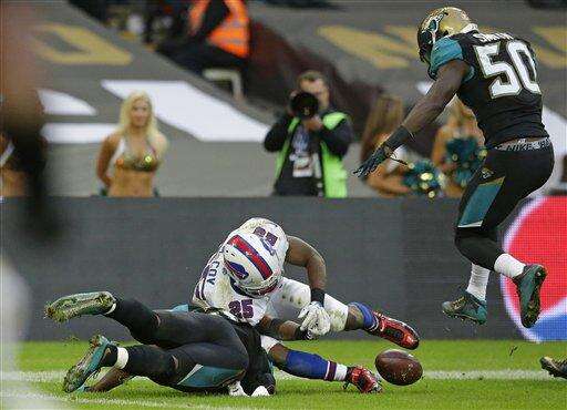 Buffalo Bills running back LeSean McCoy (25) , centre, is injured in a challenge in which he dropped the ball during the NFL game between Buffalo Bills and Jacksonville Jaguars at Wembley Stadium in London, Sunday, Oct. 25, 2015. (AP Photo/Matt Dunham) The Associated Press