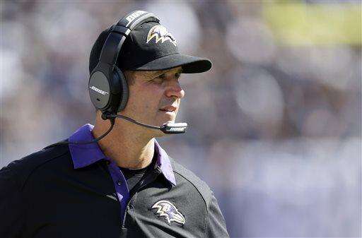 FILE - In this Sept. 20, 2015, file photo, Baltimore Ravens coach John Harbaugh watches from the sideline as his team plays the Oakland Raiders during an NFL football game in Oakland, Calif. Barring a total turnaround in performance, fans in Tennessee, Houston, Detroit and Baltimore can start thinking about the No. 1 overall draft selection. (AP Photo/Ben Margot, File) The Associated Press