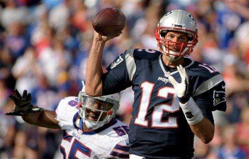 FILE - In this Sept. 20, 2015, file photo, New England Patriots quarterback Tom Brady (12) throws under pressure from Buffalo Bills defensive end Jerry Hughes (55) during an NFL football game in Orchard Park, N.Y. Barring a wave of injuries, folks in New England, Wisconsin, Colorado, Cincinnati and Charlotte can begin budgeting for playoff tickets. (AP Photo/Gary Wiepert, File) The Associated Press