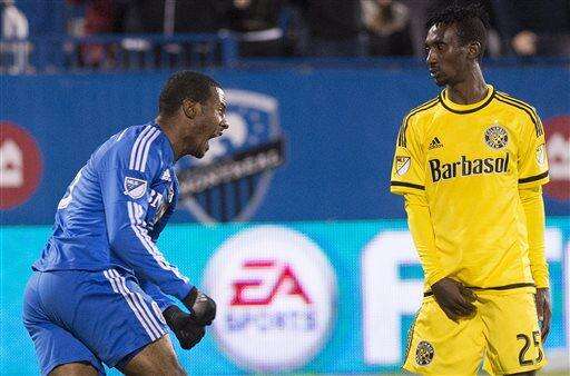Columbus Crew SC 's Harrison Afful, right, looks on as Montreal Impact's Patrice Bernier, left, celebrates after scoring against Columbus Crew SC during first half of an MLS Eastern Conference semi-final first-leg soccer match in Montreal, Sunday, Nov. 1, 2015. (Graham Hughes/The Canadian Press via AP) MANDATORY CREDIT The Associated Press