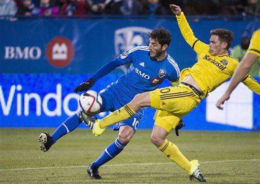 Montreal Impact's Ignacio Piatti, left, challenges Columbus Crew SC's Wil Trapp during the second half of an MLS Eastern Conference semi-final first-leg soccer match in Montreal, Sunday, Nov. 1, 2015. (Graham Hughes/The Canadian Press via AP) MANDATORY CREDIT The Associated Press