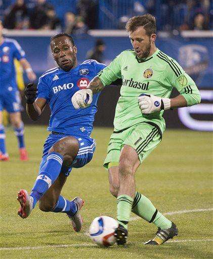 Montreal Impact's Johan Venegas, left, scores against Columbus Crew SC's goalkeeper Steve Clark during the second half of an MLS Eastern Conference semi-final first-leg soccer match in Montreal, Sunday, Nov. 1, 2015. (Graham Hughes/The Canadian Press via AP) MANDATORY CREDIT The Associated Press