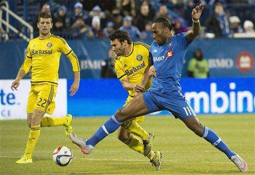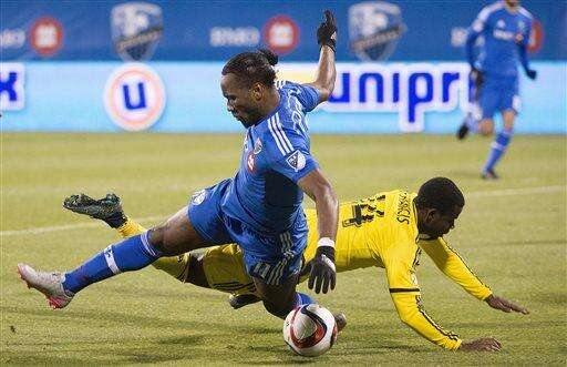 Montreal Impact's Didier Drogba, left, challenges Columbus Crew SC's Waylon Francis during second half of an MLS Eastern Conference semi-final first-leg soccer match in Montreal, Sunday, Nov. 1, 2015. (Graham Hughes/The Canadian Press via AP) MANDATORY CREDIT The Associated Press