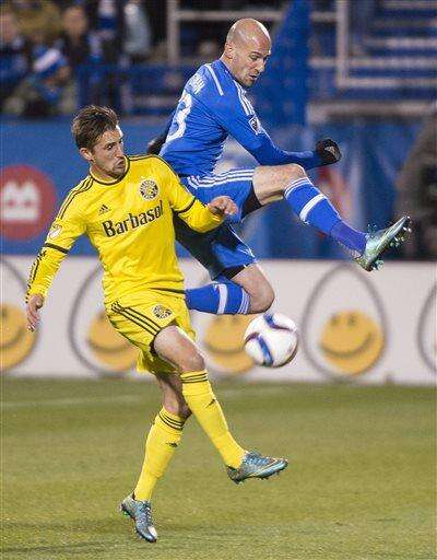Montreal Impact's Laurent Ciman, right, challenges Columbus Crew SC's Ethan Finlay during first half of an MLS soccer game in Montreal, Sunday, Nov. 1, 2015. (Graham Hughes/The Canadian Press via AP) MANDATORY CREDIT The Associated Press