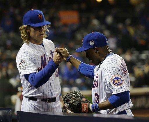 Using a blue cane adorned with a Mets logo giving to him by the team's owners, Tejada hung out with teammates in the dugout before Game 4 of the World Series.