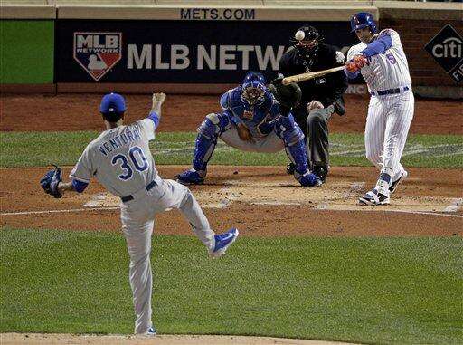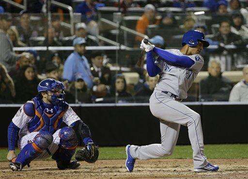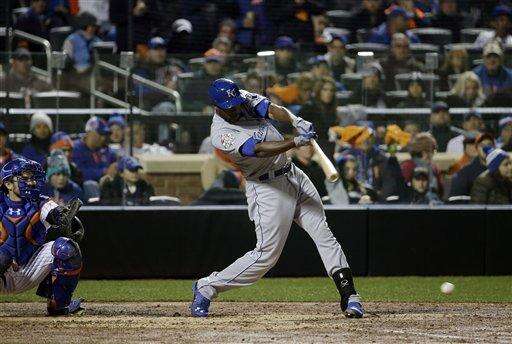 Salvador Perez hit a sinking liner to center that turned into a double when Yoenis Cespedes accidentally kicked it into left field as he reached down to try to make the catch. Alex Gordon followed with an RBI single on a hanging curve.