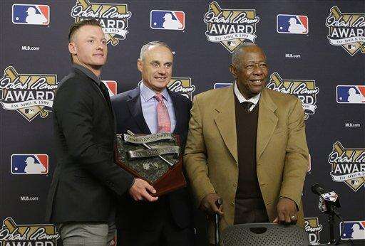 Toronto's Josh Donaldson won the American League's Hank Aaron Award and Washington's Bryce Harper was voted the NL honor.