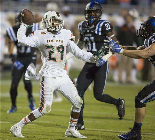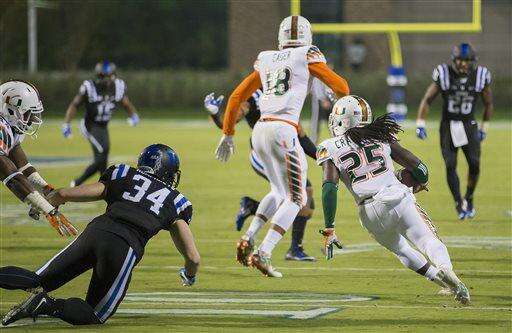 Miami's Dallas Crawford (25) returns a kickoff, which featured multiple laterals before Corn Elder subsequently received the final lateral, and scored to beat Duke 30-27 in an NCAA college football game, in Durham, N.C., Saturday, Oct. 31, 2015. (AP Photo/Rob Brown)