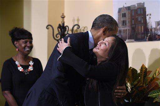 President Barack Obama hugs Sharon Boatwright during a visit to Integrity House, a residential facility in Newark, N.J., Monday, Nov. 2, 2015. Obama is calling for breaking the cycle of incarceration by helping former inmates successfully re-enter society. Boatwright is a resident and participant at Integrity and Shorter is Director of the Women's Outpatient Programs and Director of the Women's Half-Way House at Integrity House. (AP Photo/Susan Walsh)