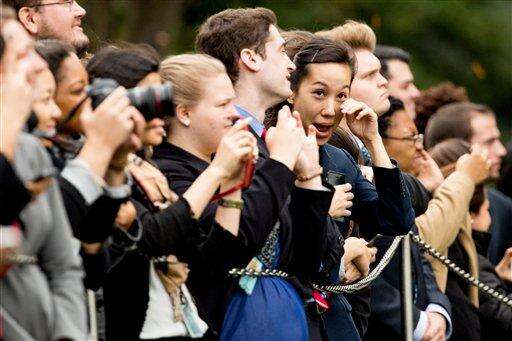 Visitors to the South Lawn of the White House watch as Marine One, carrying President Barack Obama departs from the White House in Washington, Monday, Nov. 2, 2015, for a short trip to Andrews Air Force Base, Md., on his way to Newark, N.J. Obama will spend the day highlighting the re-entry process of formerly incarcerated individuals back into society. (AP Photo/Andrew Harnik)