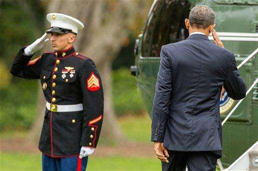 President Barack Obama returns a salute as he boards Marine One on the South Lawn of the White House in Washington, Monday, Nov. 2, 2015, for a short trip to Andrews Air Force Base, Md., on his way to Newark, N.J. Obama will spend the day highlighting the re-entry process of formerly incarcerated individuals back into society. (AP Photo/Andrew Harnik)