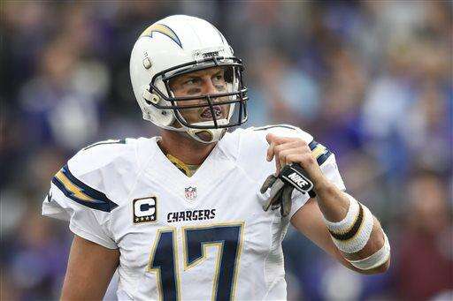 San Diego Chargers quarterback Philip Rivers (17) watch the replay of wide receiver Malcom Floyd's touchdown as he walks off the field during the second half of an NFL football game in Baltimore, Sunday, Nov. 1, 2015. (AP Photo/Gail Burton) The Associated Press
