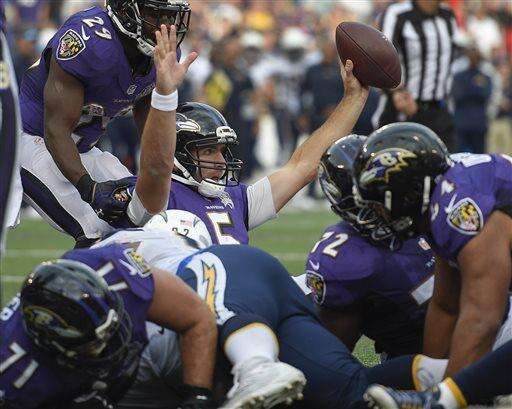 Baltimore Ravens quarterback Joe Flacco (5) holds up the ball after scoring a touchdown on a keeper during the second half of an NFL football game against the San Diego Chargers in Baltimore, Sunday, Nov. 1, 2015. The Ravens defeated the Charges 29-26. (AP Photo/Nick Wass) The Associated Press