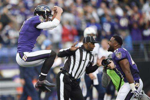 Baltimore Ravens kicker Justin Tucker (9) celebrates his game winning field goal with teammate cornerback Anthony Levine (41) during the second half of an NFL football game against the San Diego Chargers in Baltimore, Sunday, Nov. 1, 2015. The Ravens defeated the Chargers 29-26. (AP Photo/Nick Wass) The Associated Press