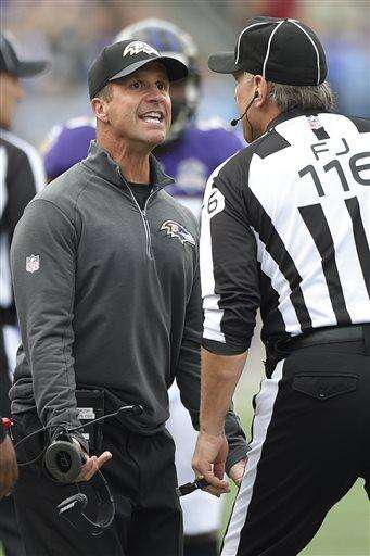 Baltimore Ravens head coach John Harbaugh argues with side judge Mike Weatherford (116) during the first half of an NFL football game against the San Diego Chargers in Baltimore, Sunday, Nov. 1, 2015. (AP Photo/Nick Wass) The Associated Press