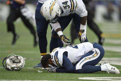 San Diego Chargers outside linebacker Melvin Ingram (54) reaches for his teammate cornerback Patrick Robinson (26) after an injury during the second half of an NFL football game against the Baltimore Ravens in Baltimore, Sunday, Nov. 1, 2015. The Ravens defeated the Chargers 29-26. (AP Photo/Nick Wass) The Associated Press