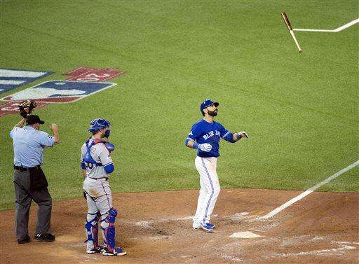 BAUTISTA'S BAT TOSS: To call it a bat flip would be a disservice to Jose Bautista. In the midst of mayhem in Toronto, he sent his stick flying after homering vs. Texas during the deciding Game 5 of AL Division Series. It was likely the most crazy, emotional inning in big league history - the seventh at Rogers Centre included two bench-clearing scuffles, fans throwing debris, police on the field and errors on three straight balls. And it all started when Blue Jays catcher Russell Martin hit Shin-Soo Choo's bat on a routine throw back to the pitcher, letting a run score and prompting an umpires' conference.