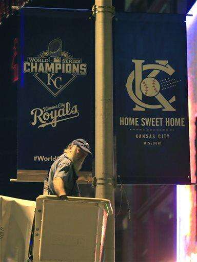 A city worker hangs World Series banners on street light poles in Kansas City, Mo., Monday, Nov. 2, 2015. The Kansas City Royals defeated the New York Mets to win the World Series. (AP Photo/Orlin Wagner) The Associated Press