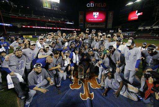 Kansas City Royals pose with World Series trophy after Game 5 of the Major League Baseball World Series against the New York Mets Monday, Nov. 2, 2015, in New York. The Royals won 7-2 to win the series. (AP Photo/Matt Slocum) The Associated Press