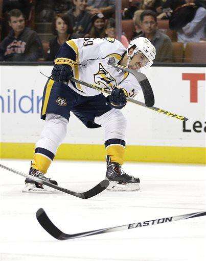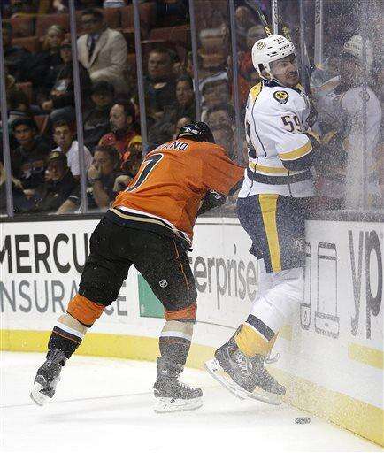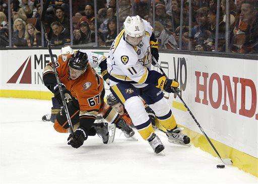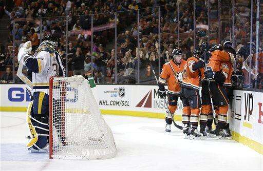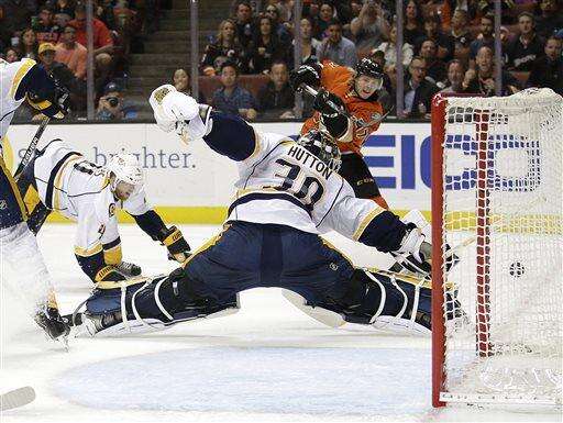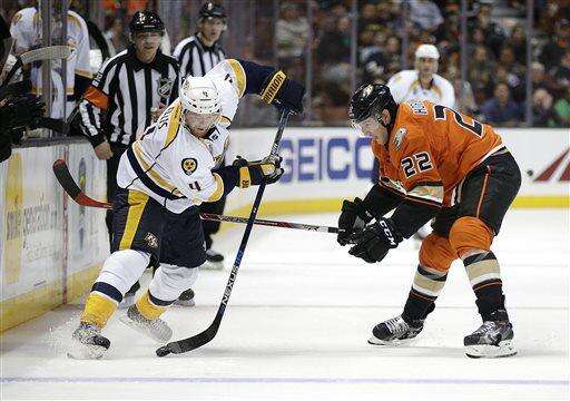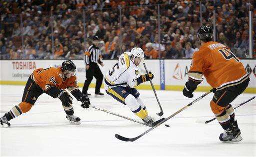 NOTES: Despite holding a 3-0-1 record and .945 save percentage against Western Conference opponents this season, Predators G Pekka Rinne got the afternoon off. ... Predators F Miikka Salomaki made his first career start. It was only Salomaki's second NHL appearance, as he suffered a shoulder injury that required surgery playing for the Predators' AHL affiliate last season. ... The Predators won 5-1 at home on Oct. 22, and the teams will conclude their three-game season series Nov. 17 in Nashville. ... Sekac left the game with a lower-body injury. ... Anaheim's other win was 4-1 against Minnesota on Oct. 18.