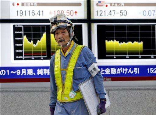 A worker walks past an electronic stock indicator showing the Nikkei 225 was up 1 percent at 19,116.41 in Tokyo Thursday, Nov. 5, 2015. Chinese stocks surged for a second day Thursday as confidence grew that stimulus measures are helping the world's No. 2 economy to stabilize. Other Asian markets were mixed on renewed expectations that the Federal Reserve's first rate hike in nearly a decade could take place as early as next month.(AP Photo/Shuji Kajiyama)