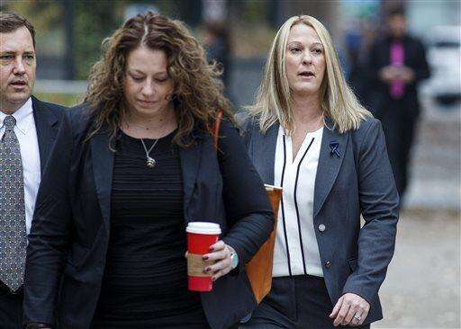 Hummelstown police Officer Lisa Mearkle, far right, arrives for the third day of her murder trial at the Dauphin County Courthouse in Harrisburg, Pa., on Thursday, Nov. 5, 2015. Mearkle is charged with third-degree murder for shooting David Kassick after he fled from a Feb. 2 traffic stop in Hummelstown, a Harrisburg suburb. The shooting was captured by a camera attached to her stun gun. (Dan Gleiter/PennLive.com via AP) MANDATORY CREDIT