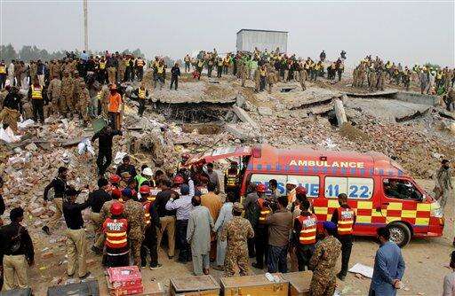 Pakistan army soldiers and volunteers take part in a rescue work in Lahore, Pakistan, Thursday, Nov. 5, 2015. A factory building under construction in an industrial area on the outskirts of Pakistan's eastern city of Lahore collapsed, killing many workers and injuring dozens, officials said. (AP Photo/K.M. Chaudary)