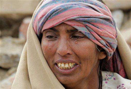 Pakistani woman Nasreen sits on debris of a collapsed building waiting for her missing son to be evacuated in Lahore, Pakistan, Thursday, Nov. 5, 2015. A factory building under construction in an industrial area on the outskirts of Pakistan's eastern city of Lahore collapsed, killing many workers and injuring dozens, officials said. (AP Photo/K.M. Chaudary)