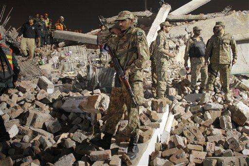 Pakistan army soldiers take part in rescue work following the collapse of a building in Lahore, Pakistan, Wednesday, Nov. 4, 2015. The factory building under construction in an industrial area on the outskirts of Pakistan's eastern city of Lahore collapsed on Wednesday, killing many workers and injuring dozens, officials said. (AP Photo/K.M. Chaudary)