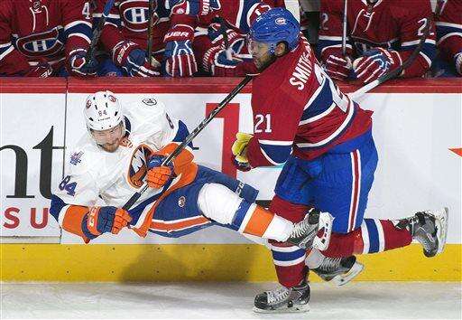 Montreal Canadiens' Devante Smith-Pelly, right, collides with New York Islanders' Mikhail Grabovski during first period NHL hockey action, in Montreal, on Thursday, Nov. 5, 2015. (Graham Hughes/The Canadian Press via AP) The Associated Press