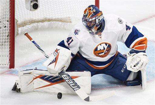 New York Islanders' goaltender Jaroslav Halak makes a save during first period NHL hockey action against the Monttreal Canadiens, in Montreal, on Thursday, Nov. 5, 2015. (Graham Hughes/The Canadian Press via AP) The Associated Press