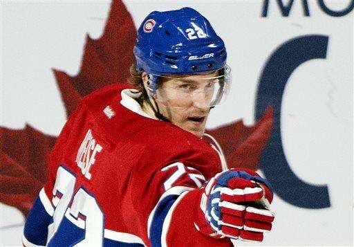 Montreal Canadiens' Dale Weise celebrates after scoring against the New York Islanders during first period NHL hockey action, in Montreal, on Thursday, Nov. 5, 2015. (Graham Hughes/The Canadian Press via AP) The Associated Press