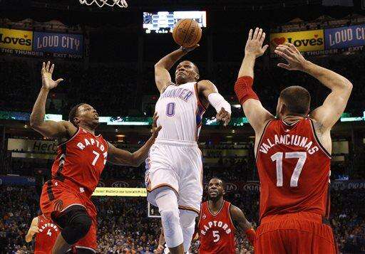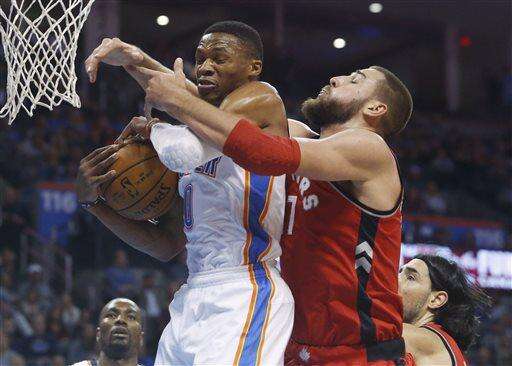 Thunder: Oklahoma City held Toronto to 5-for-24 shooting in the first quarter. ... On one first-quarter possession, Steven Adams blocked three shots. He finished with four, and the Thunder had 10. ... Oklahoma City committed nine turnovers in the second quarter. ... Kanter's 3-pointer as time expired in the third gave the Thunder an 81-73 lead. ... The Thunder scored 42 points in the third quarter on 16-for-22 shooting. ... Westbrook's assist total was one off his career high of 17, set three times last season.