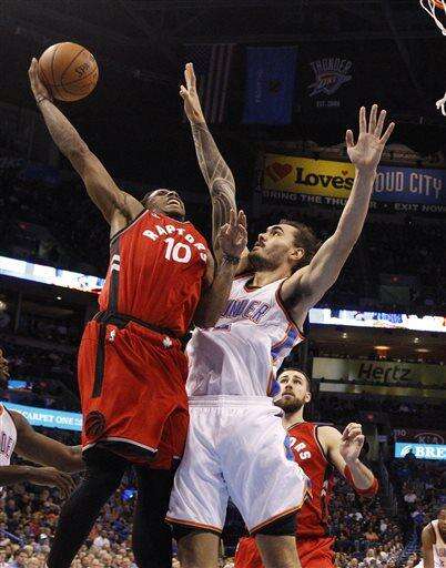 Durant missed the second of two free throws, but the Thunder scrambled and forced a jump ball. Toronto won the tip, and DeRozan made two free throws with 9.3 seconds to play to seal the game.