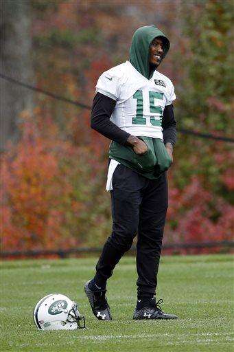 New York Jets wide receiver Brandon Marshall stands on a practice field during NFL football practice, Thursday, Nov. 5, 2015, in Florham Park, N.J. (AP Photo/Julio Cortez) The Associated Press