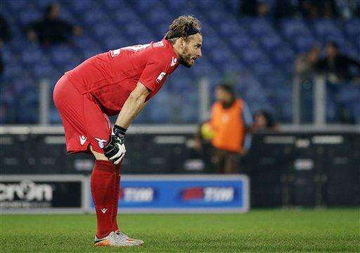 Lazio goalkeeper Federico Marchetti looks on after AC Milan's Carlos Bacca scored during a Serie A soccer match between Lazio and Milan, at Rome's Olympic Stadium, Sunday, Nov. 1, 2015. (AP Photo/Andrew Medichini) The Associated Press