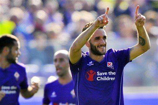 Fiorentina's Gonzalo Rodriguez celebrates after scoring during the Italian Serie A soccer match between Fiorentina and Frosinone at the Artemio Franchi stadium in Florence, Italy, Nov. 1 2015. (Maurizio Degl' Innocenti/ANSA via AP Photo) ITALY OUT The Associated Press