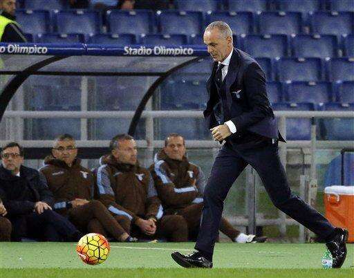 Lazio coach Stefano Pioli chases the ball during a Serie A soccer match between Lazio and Milan, at Rome's Olympic Stadium, Sunday, Nov. 1, 2015. (AP Photo/Andrew Medichini) The Associated Press