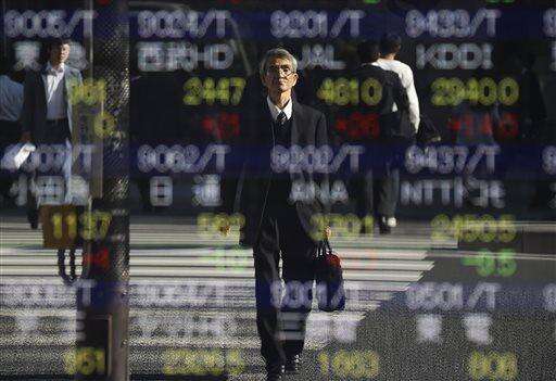 A man is reflected on the electronic board of a securities firm in Tokyo, Japan, Friday, Nov. 6, 2015. (AP Photo/Koji Sasahara)