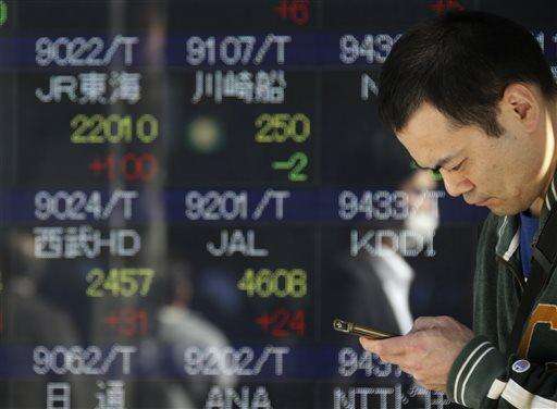 A man looks at his mobile phone in front of an electronic stock board of a securities firm in Tokyo, Japan, Friday, Nov. 6, 2015. (AP Photo/Koji Sasahara)